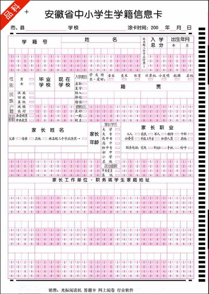 信息卡(又稱答題卡)是光標閱讀機輸入信息的載體,是配套光標閱讀機的各種信息錄入表格的總稱。信息卡將用戶需要的信息轉化為可選擇的選項,供用戶涂寫。OMR設備根據信息點的涂與未涂和格式文件設置將信息還原。信息卡的式樣,是根據輸入計算機的信息并按照光標閱讀機的設計規范所要求的格式而設計的。為了實現數據的準確識別,信息卡要按一定的格式與方法進行設計,設計人員需經過培訓,才能設計出有效的信息卡。答題后,答題卡上的信息通過光標閱讀機識別通過配套軟件,使涂點數據錄入到計算機中。